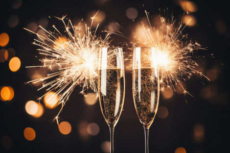 Toasting champagne for festive celebrations. Glasses of sparkling wine in front of golden bokeh lights and glowing sparklers. Horizontal background for Christmas, New Year, parties and festive events.