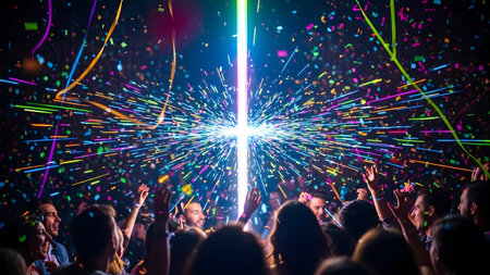 Crowd celebrating at a lively concert with vibrant confetti falling against a colorful backdrop at night