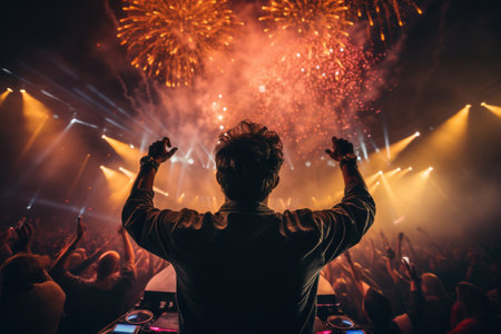 Unfocused image of a joyful crowd with raised hands enjoying a night celebration with colorful fireworks and confetti.