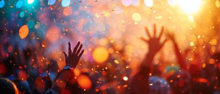 cheering crowd with raised hands and falling confetti at concert - music festival