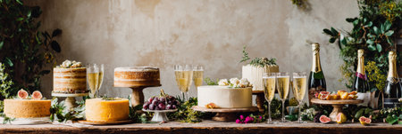 An elegant dessert display showcases various cakes and champagne glasses in a stylish setting, adorned with natural elements and fresh fruits.
