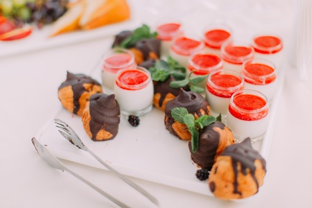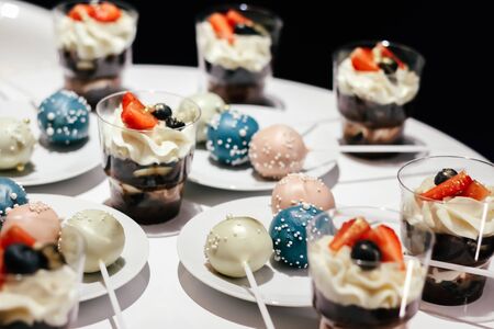 desserts with fruits, mousse, biscuits. Different types of sweet pastries, small colorful sweet cakes, macarons, and other desserts in the sweet buffet. candy bar for birthday