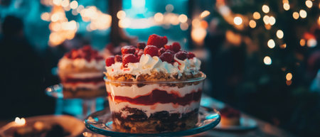 Festive layered trifles with colorful fruits and cream for a delightful dessert experience