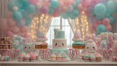A festive dessert table is arranged with several decorated cakes and cupcakes. Pastel colors dominate the scene, including pink and blue. The composition includes balloons and decorative elements. This imagery is suitable for use in celebrations, events, or commercial projects requiring a celebratory aesthetic.