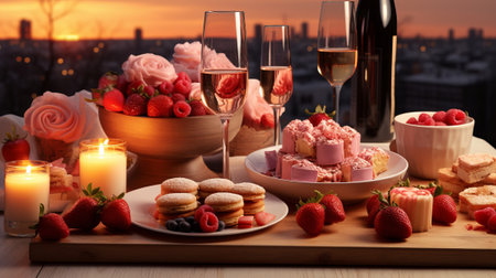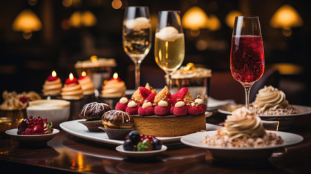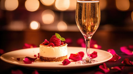 A close-up of a luxurious dessert on a fine china plate, set next to a glass of champagne, with rose petals scattered around, leaving ample room for messaging.