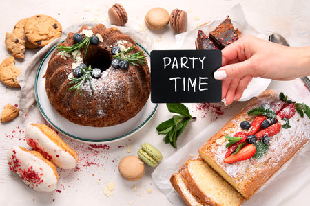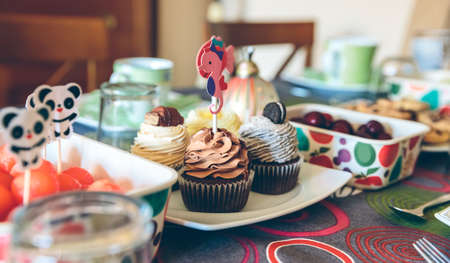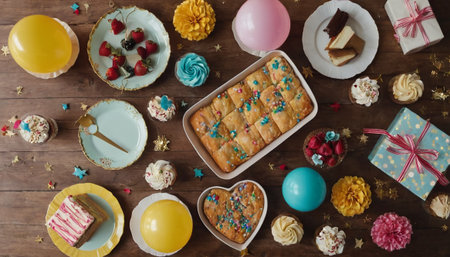 Overhead view of festive table setting with cupcakes, muffins and candies