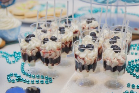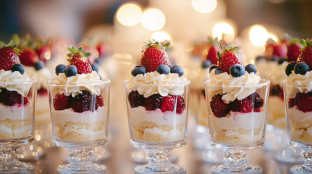 Elegant dessert table with layered berry trifles in glasses at festive event
