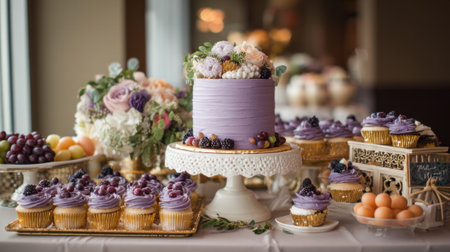 A beautifully arranged dessert table features a lavender cake surrounded by cupcakes and fresh fruit. Flowers add elegance to the cozy atmosphere as guests enjoy the treats.