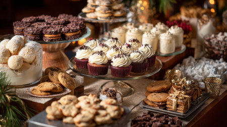 A beautifully arranged dessert table featuring an assortment of cupcakes, cookies, and pastries, perfect for festive celebrations and special occasions.