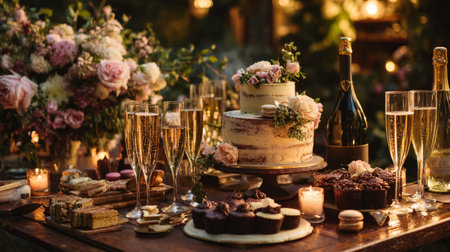 A celebration table filled with decadent desserts, bubbly champagne, and a stunning floral cake centerpiece, warm golden evening light