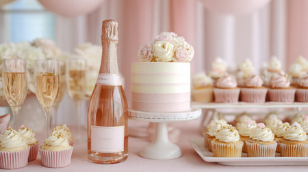 Beautifully styled dessert table with champagne, cupcakes, and a stunning cake centerpiece, soft pastel tones, elegant party mood