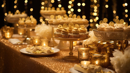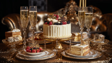 Luxurious golden-themed party table with champagne towers, rich desserts, and an opulent cake centerpiece, sophisticated upscale vibe
