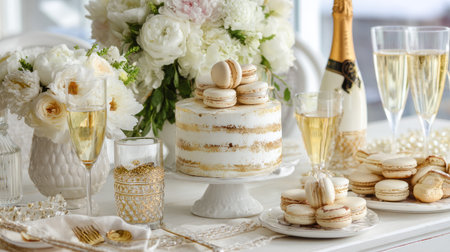 White and gold themed party table with champagne, macarons, and a tiered cake, soft natural light, clean and sophisticated styling