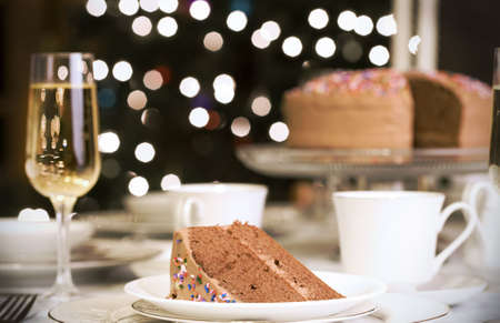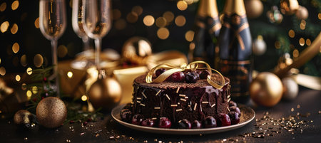 Warm and inviting celebration scene with cake and champagne, rustic decor accents, and soft lighting for a cozy, yet refined atmosphere