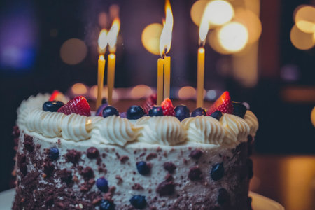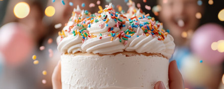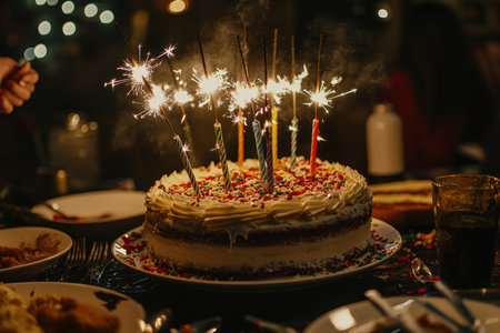 A beautifully decorated birthday cake sits elegantly on a table, illuminated by the glow of flickering candles and the sparkle of dazzling sparklers. Surrounding the cake, confetti adds a festive touch, while friends and family gather nearby, creating a joyful atmosphere. This vibrant celebration captures the essence of a memorable birthday moment.
