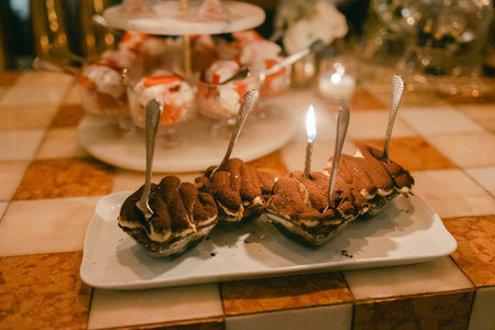 A tasty tiramisu with candles is on the table, surrounded by colorful cupcakes at a festive gathering.