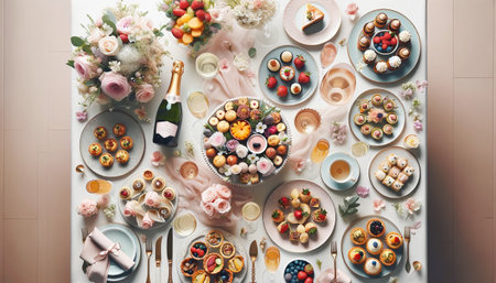 Top-down view of a bridal shower brunch, featuring canapes, mini quiches, fruit platter, prosecco, and a tiered cake, with floral and pastel decorations