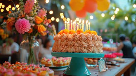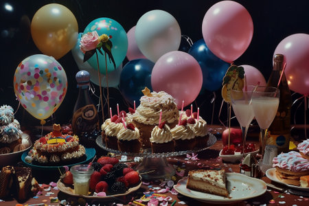 A vibrant gathering features a beautifully arranged table, adorned with balloons, cakes, and desserts, radiating joy and festivity.
