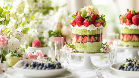 A stunning layered cake adorned with fresh strawberries and floral accents, perfect for any celebration or gathering. A true feast for the senses!