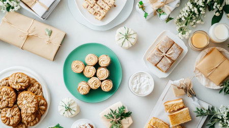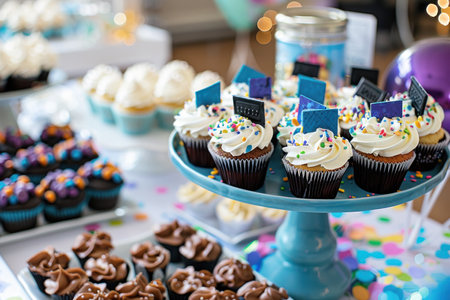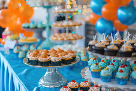 A festive dessert table with a variety of miniature treats, including cupcakes, cookies, and pastries. Generative AI
