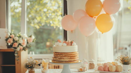 A festive table displays a meticulously crafted layered cake adorned with fruits, accompanied by pastel balloons and floral arrangements, creating a warm atmosphere for celebration.