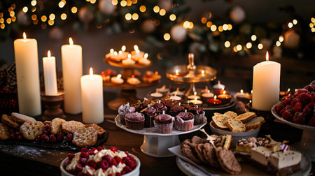 Festive table with assorted desserts, pastries, candles, and decorative lights