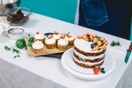 Set of different delicious tasty muffins with berries on summer background. Different dessert tartlets with cream and fresh blueberry and raspberry. Selective focus. candy bar concept