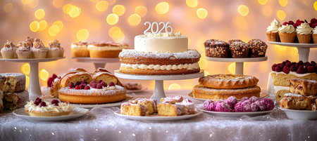 Delectable Spread of Cakes and Treats for Celebrating the Year 2026 with Festive Bokeh Background