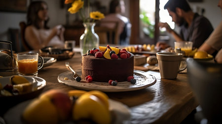 An AI generated illustration of a delicious fruit cake with toppings on the table