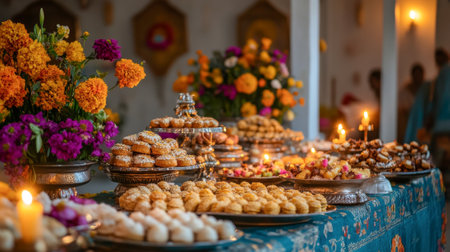 Traditional festive decor with assorted Indian sweets and candles on elegant table. concept of cultural celebration, festive gatherings, indulgence in sweets.