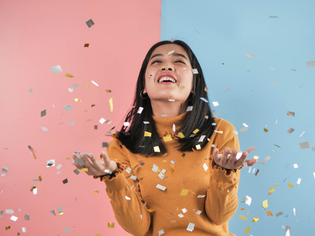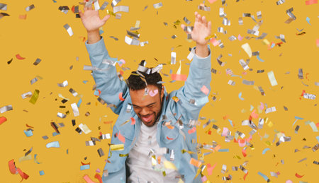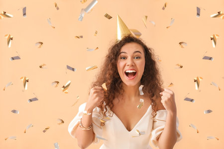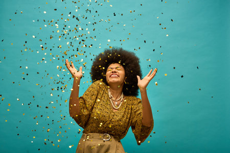 A stylish African American woman with hands raised in celebration, confetti falling from her hair.