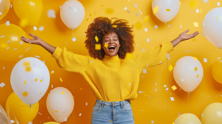 Joyful and vibrant scene featuring young woman smiling and standing in joy against bright yellow background with balloons and confetti.