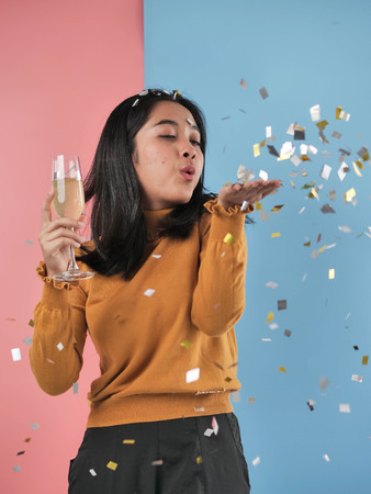 Happy Asian woman holding champagne glass with silver and gold papers falling down, celebration concept.