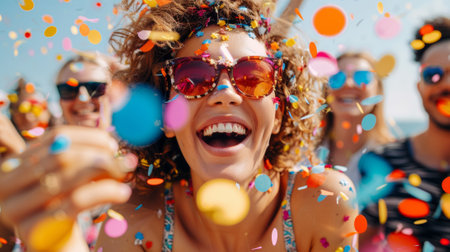 Group of friends enjoying a joyful celebration, surrounded by colorful confetti and bright lights.