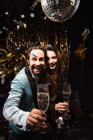 cheerful couple clinking champagne glasses near sparkling christmas decoration on black