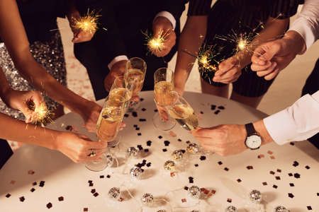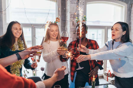 Close-up view of business team of multinational employees holding Bengal lights, clinking glasses of champagne and smiling cheerfully at corporate New Year or Happy Christmas eve.
