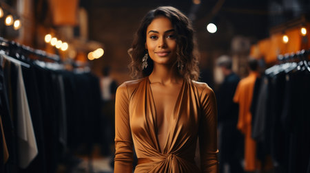 Fashion boutique receptionist among trendy clothing reflecting latest trends