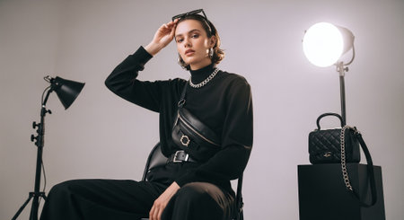 Stylish female model struts in dark attire at fashion week, captivating audience with confidence, elegance, and flair.