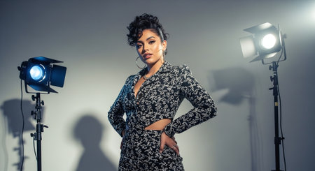 Fashionable young african american woman with afro hairstyle posing on stage.