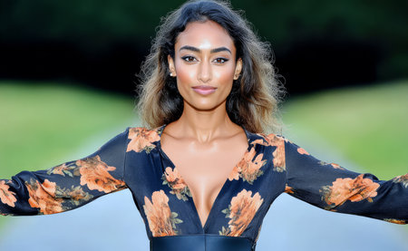 A young woman stands outdoors in a floral dress with her arms open wide. Her confident expression complements the vibrant greenery in the background suggesting a joyful and carefree atmosphere.