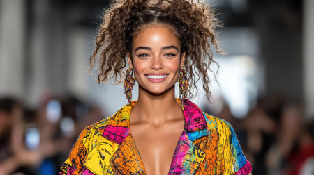 A woman confidently walks down the runway at a fashion show, showcasing the latest designs.
