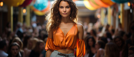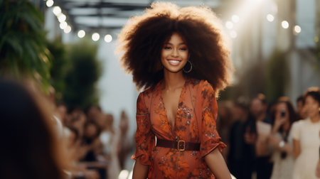 A beautiful model walking fashionably on the catwalk. Fashion show. Generative Ai