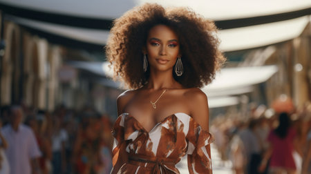 fashion outdoor photo of beautiful sensual woman with afro hair in elegant dress walking in summer city