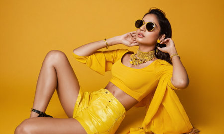 A confident young Indian supermodel woman in a cropped yellow top, white shorts, and fashionable accessories strikes a striking pose.