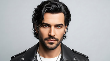 A young man with stylish hair wearing a black leather jacket and a white t-shirt, posing against a neutral background