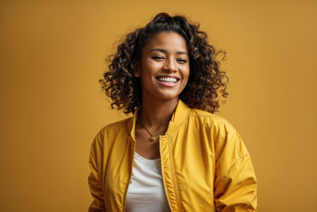 Happy Beauty: Portrait of Mixed-race Woman in Yellow Jacket on Yellow Background. Vibrant and Stylish: Happy Young Mixed-race Girl in Yellow Jacket on Bright Background.