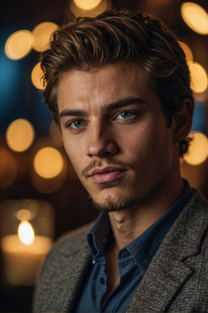 Large Portrait of a Young Beautiful man at a Party Atmosphere with a Subtle Smile