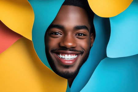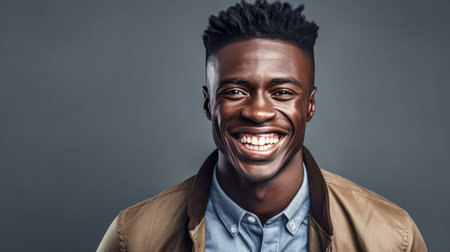 African American man radiates joy and positivity in a formal studio setting. Concept Portrait Photography, Studio Photoshoot, Joyful Expression, African American Model, Positive Vibe