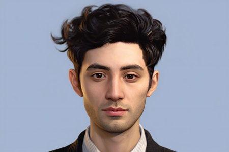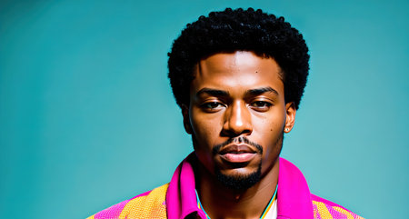 A young man with short, curly hair wearing a colorful shirt and standing in front of a blue background.