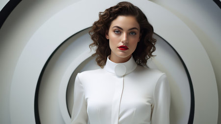 beautiful young woman in white dress looking at camera in futuristic interior